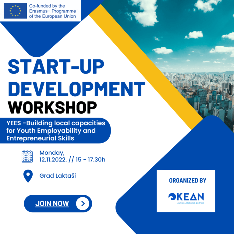 У склопу пројекта „YEES – Building local capacities for Youth Employability and Entrepreneurial Skills“ финансираног од стране Евуропске комисије, чија је вриједност 150.000,00 € одржаће се дводневна радионица о развоју предузетништва на подручју града Лакташи. Радионица је планирана за суботу 12.11.2022. године, са почетком у 12.00 часова, у Хотелу Сан.