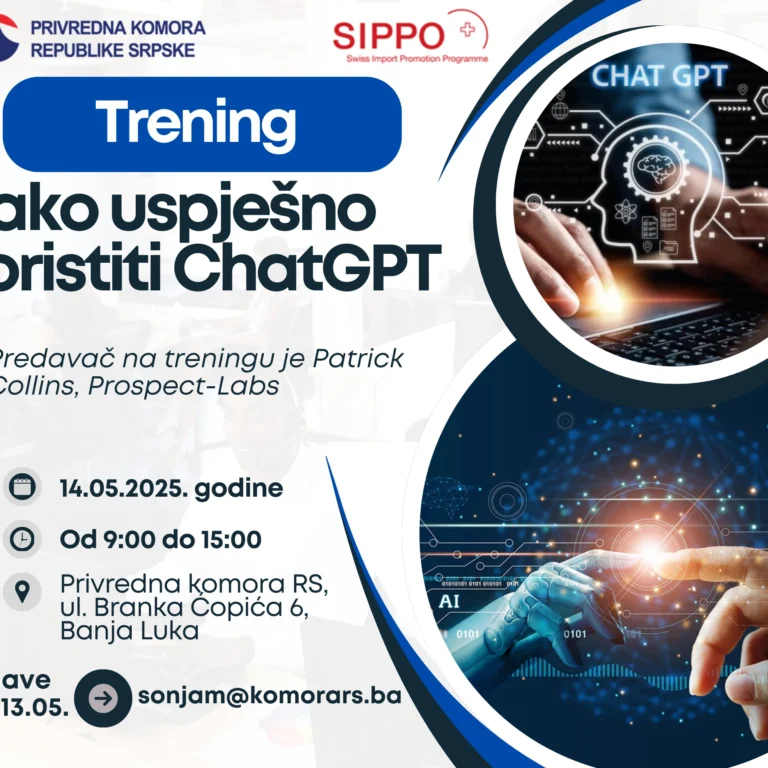 Привредна комора Републике Српске, уз подршку Швајцарског програма за промоцију извоза (SIPPO), организује тренинг на тему „Како успјешно кориситити ChatGPT“. ДЕТАЉИ ДОГАЂАЈА Тема: Како успјешно користити ChatGPT Датум: Сриједа, 14. мај 2025. Вријеме: Почетак у 9:00 часова Локација: Привредна комора Републике Српске, ул. Бранка Ћопића 6, Бања Лука ЦИЉ ТРЕНИНГА Пружити учесницима конкретна знања и вјештине за кориштење ChatGPT-a као…