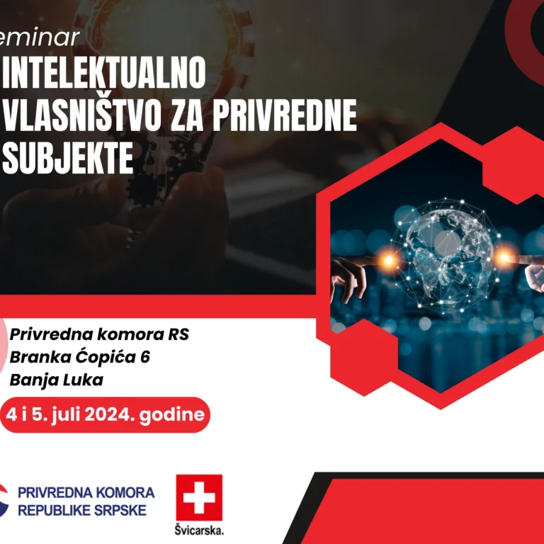 The Chamber of Commerce of Republika Srpska, in collaboration with the Institute for Intellectual Property of Bosnia and Herzegovina, within the framework of the projects “EU Support for Intellectual Property Rights in BiH” and “Engage, Inspire, Empower – Women in Business,” funded by the Government of Switzerland, is organizing a seminar on the topic “Intellectual…